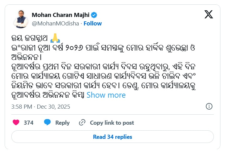 ସୋସିଆଲ ମିଡିଆ ଏକ୍ସରେ ମୁଖ୍ୟମନ୍ତ୍ରୀ କହିଛନ୍ତି, ଇଂରାଜୀ ନୂଆ ବର୍ଷ ୨୦୨୬ ପାଇଁ ସମସ୍ତଙ୍କୁ ମୋର ହାର୍ଦ୍ଦିକ ଶୁଭେଚ୍ଛା ଓ ଅଭିନନ୍ଦନ। ନୂଆବର୍ଷର ପ୍ରଥମ ଦିନ ସରକାରୀ କାର୍ଯ୍ୟ ଦିବସ ରହୁଥିବାରୁ, ଏହି ଦିନ ମୋର କାର୍ଯ୍ୟାଳୟ ଗୋଟିଏ ସାଧାରଣ କାର୍ଯ୍ୟଦିବସ ଭଳି ଚାଲିବ ଏବଂ ନିୟମିତ ଭାବେ ସରକାରୀ କାର୍ଯ୍ୟ ହେବ। ତେଣୁ, ମୋର କାର୍ଯ୍ୟାଳୟକୁ ନୂଆବର୍ଷର ଅଭିନନ୍ଦନ କିମ୍ବା ଶୁଭେଚ୍ଛା ଜଣାଇବା ପାଇଁ କେହି ନ ଆସିବାକୁ ଅନୁରୋଧ। ସରକାରୀ କର୍ମଚାରୀମାନେ ମଧ୍ୟ ଅଫିସ ସମୟରେ ଶୁଭେଚ୍ଛା ଓ ଅଭିନନ୍ଦନ କାର୍ଯ୍ୟକ୍ରମରେ ସାମିଲ ନ ରହି, ଅଫିସ୍ କାର୍ଯ୍ୟ ଉପରେ ଗୁରୁତ୍ୱ ପ୍ରଦାନ କରିବାକୁ ଅନୁରୋଧ। ଓଡ଼ିଶାର ଜନସାଧାରଣ ତଥା ମୋର ଶୁଭାକାଂକ୍ଷୀଙ୍କ ସଦିଚ୍ଛା ମୋ ସହିତ ସବୁବେଳେ ରହିଆସିଛି। ସେଥିପାଇଁ ମୁଁ ସମସ୍ତଙ୍କ ନିକଟରେ କୃତଜ୍ଞ।